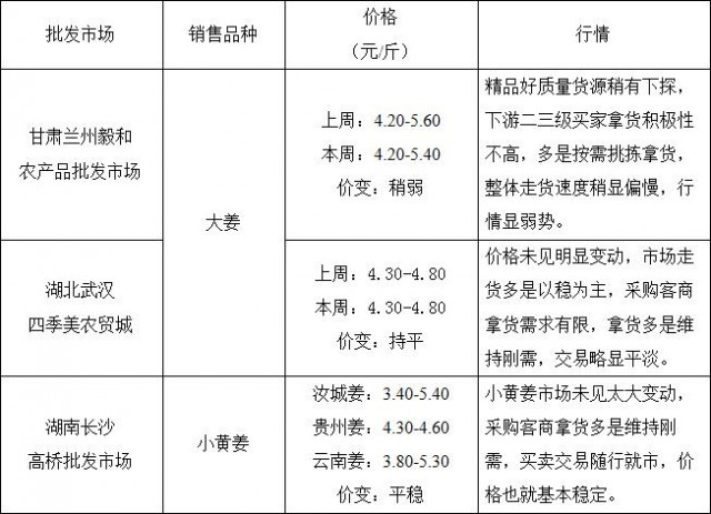 湖南汝城产区价格未见明显变动,持有好质量货源的农户仍较为惜售,多是交易一般质量货源为主,发市场客商拿货积极性一般,按需采购合适货源,行情运行较为平稳。当地成交价格多在4.20-4.30元/斤。湖南双牌产区买卖交易随行就市,目前当地姜种交易较为顺畅,走货速度还算稳定,商品姜交易情况一般,整体价格较年前稍有上调。目前当地好质量窖姜价格在4.50元/斤左右。好质量姜种价格在5.00元/斤。