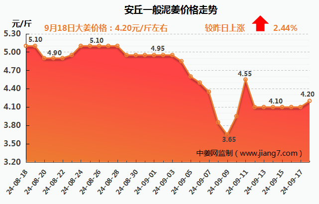 安丘黑埠子市场上午上货18车左右,今日供应依旧不多,好质量货源少,由于连续3天市场上货偏少,部分市场有缺货现象,买家拿货较为积极,因小贩要价上撑,成交价格有1毛左右的上涨,下货尚可,主流交易价格4.00-4.40元/斤;黑埠子市场泥姜交易价在3.60-4.90元/斤。