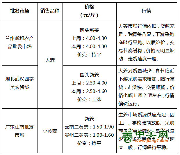 生姜销区市场行情稳硬运行,部分地区价格出现小幅上调。其中大姜销区货源供应量维持正常水平,经营商户多随行就市出货,交易随行开展,部分地区大姜价格小幅上浮,终端消费者按需采购,整体走货顺畅;小姜销区方面,云南、贵州产区二黄姜行情平稳运行,受学校、工厂放假影响,市场交易略有回落。