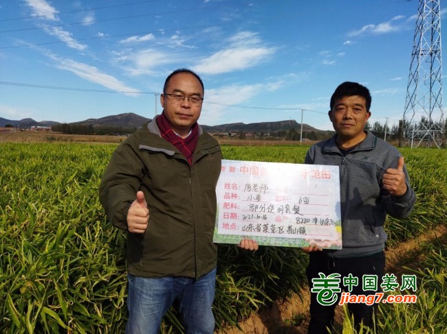 测产组成员最终测得唐老师亩产泥姜16307斤!去杂35%后亩产净姜高达10600斤!一举刷新本地小黄姜产量新高。喜获丰收的唐老师非常感谢中国姜网科学的技术指导与过硬的肥料支持,欣喜的要与王总合影留念!
